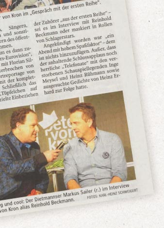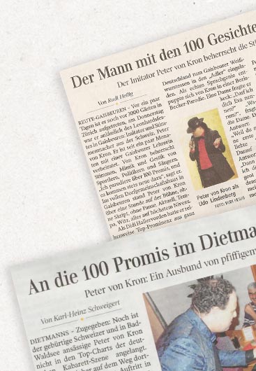 „Peter von Kron: fast wie in echt gestaltete der studierte Philosoph mit Tempo und Witz ein zweistündiges Feuerwerk der gekonnten Parodie, gewürzt und bereichert mit trefflichen Persiflagen und feinen Wortspielen.“